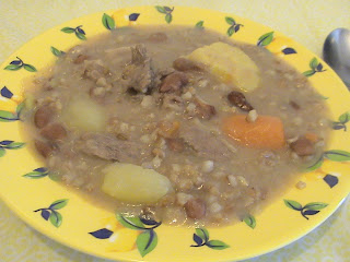 Como preparar: De véspera, demolhe separadamente o feijão, a carne e o trigo. No dia coloque numa panela 3 litros de água, juntamente com a carne cortada em cubos, o feijão e o trigo.Leve a lume e deixe ferver por meia hora. Decorrido esse tempo, adicione a cebola, a pimenta e a segurelha e deixe apurar por mais 10 minutos. Acrescente os restantes ingredientes e deixe cozer por mais 35 minutos, mexendo de vez em quando. Por fim, rectifique os temperos e apague o lume. Deixe repousar por 30 minutos e sirva de seguida. |