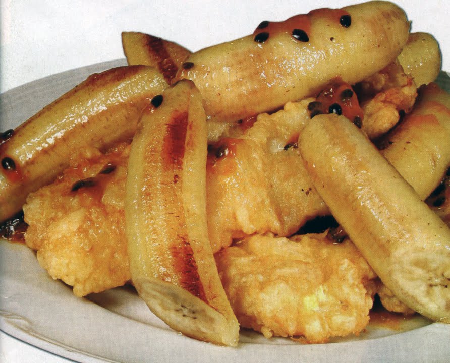 Como preparar: Tempere os filetes com os dentes de alho picados finamente, o sumo de limão, sal e pimenta. Deixe marinar durante 1 hora. Escorra depois os filetes, passe-os por farinha e pelos ovos, previamente batidos e leve-os a fritar em óleo de ambos os lados. Escorra-os e coloque-os numa travessa. Aqueça o óleo numa frigideira. Descasque as bananas, corte-as ao meio, junte-as à frigideira e deixe-as fritar de ambos os lados. Retire-as do lume e misture-as com os filetes. Abra os maracujás, retire-lhes a polpa com uma colher, coloque-a por cima dos filetes e das bananas e sirva. |